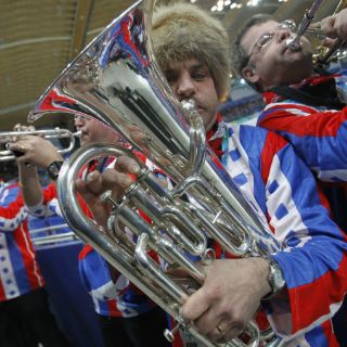 La banda, que mantiene entretenidas a las multitudes en las pistas de patinaje durante los descansos para arreglar la superficie de hielo en las competiciones olímpicas, es conocida por su conmovedora interpretación de "Sweet Caroline" de Neil Diamond y "We are the Champions" de Queen. Los músicos suelen conseguir que miles de aficionados de todas las nacionalidades se contagien y bailen mientras recorren el gran óvalo con el permiso de los organizadores. Incluir un mensaje político sería algo nuevo para ellos.