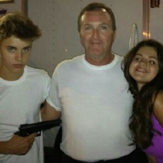 Las fotos del ídolo le fueron tomadas en la locación del próximo filme de Selena Gómez titulado "Feed the dog" y como todo un "macho" se le ve posando con un arma falsa, mientras finge apuntarle a un hombre, y su novia sonríe.