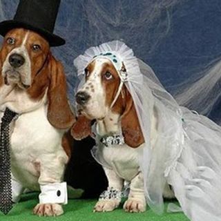 Para los perros machos invitados a casamientos, ofrece trajes de noche con corbata, mientras que las hembras pueden llevar vestidos decorados con velos y colas.