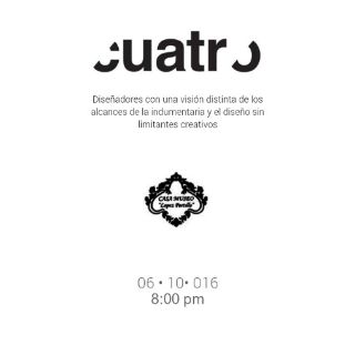 GUADALAJARA, JALISCO (05/OCT/2016).- Este jueves 6 de octubre a las 20:00 horas, cuatro diseñadores de moda emergentes: Alejandro Bonetta, Regina Mondragón, Eloisa Velásquez y Denisee Camarena, presentarán sus colecciones en Casa Museo López Portillo en el marco de un proyecto que ellos mismos denominaron "Cuatro", una plataforma que busca impulsar a jóvenes como ellos desde los temas creativos hasta lo tangible que tienes que ver con la presentación de sus prendas y el empuje en el mercado.