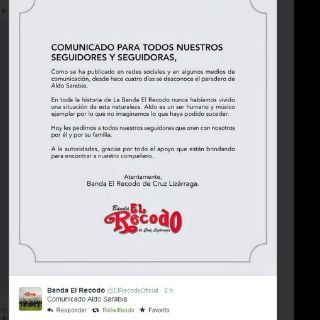 El grupo musical agregó: "En toda la historia de La Banda El Recodo nunca habíamos vivido una situación de esta naturaleza. Aldo es un ser humano y músico ejemplar por lo que no imaginamos lo que haya podido suceder".