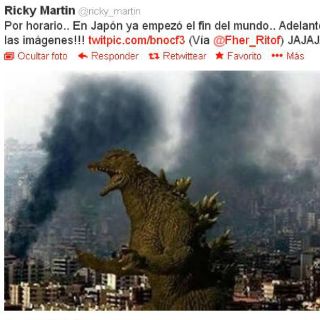 Ricky Martin, fue de los que tomó con humor esta predicción al publicar una foto del emblemático monstruo "Godzilla" destruyendo una ciudad, seguido de la leyenda: "Por horario... En Japón ya empezó el fin del mundo.. Adelante con las imágenes!!".