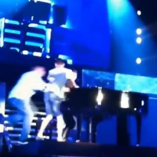 El cantante logra zafarse de su seguidor, quien es detenido por el personal de seguridad inmediatamente, pero los forcejeos provocan que el piano de cola se vuelque.