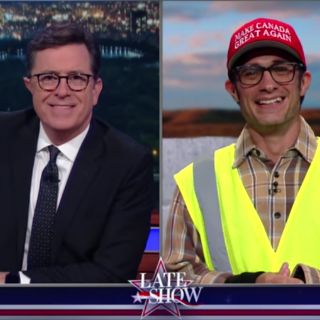 "¿Por qué un canadiense está construyendo nuestro muro mexicano?", cuestionó el presentador norteamericano. "Oh no, estoy en Alberta (Canadá), Steven. Estoy construyendo esta pared para mantener a los estadounidenses fuera. Porque si Donald Trump es elegido, ustedes van a huir como locos a Canadá. Van a quitarnos trabajos y robarán a nuestras mujeres canadienses. ¡Mantengan sus sucias manos americanas lejos de Celine Dion!".