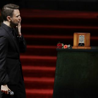 El joven cantó "Se me olvidó otra vez", y se despidió de Juanga al besar la urna con las cenizas del cantautor.