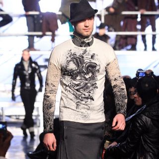 PARÍS, FRANCIA (19/ENE/2012).- Un nuevo "dandy" urbano, amante del grafiti y por supuesto del tatuaje, inspira la colección Jean-Paul Gaultier para la próxima temporada invernal, presentada hoy en sus salones de la calle Saint Martin.