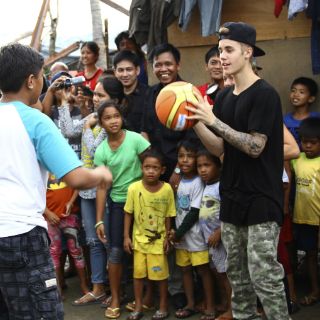 Bieber se dio tiempo de jugar basquetbol, firmar autógrafos y convivir con algunos niños en la zona de Tacloban, una de las más afectadas por el tifón.