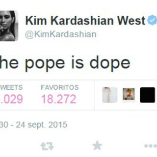 A propósito de la presencia del papa Francisco en Estados Unidos, la modelo y estrella de “reality” tuiteó: “The pope is dope”, un juego de palabras que involucra una rima y podría interpretarse como “el papa está dopado”. Sin embargo, también es una expresión que en el uso cotidiano sirve para decir lo bueno que es algo.