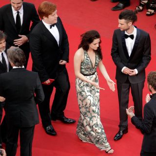 Diez minutos antes de la proyección lo hizo Stewart, acompañada de Walter Salles. Llegaron a las puertas del Palacio de Festivales de Cannes en un coche azul de los años cuarenta, la época en la que se sitúa "On the road".