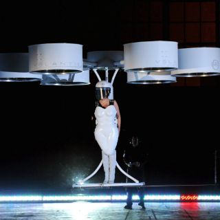 La cantante de "Applause" develó un vehículo blanco de alta tecnología al que promociona como el primer vestido volador del mundo. El artilugio la elevó adentro de un enorme edificio en el arsenal naval de Brooklyn, donde realizó una fiesta por el lanzamiento de su nuevo álbum el domingo.