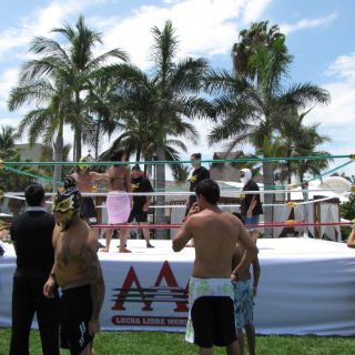 Tras las prácticas, los luchadores acudieron a una "pool party" para continuar la convivencia con los huéspedes previo al espectáculo de las seis de la tarde, donde habrá cuatro luchas.
