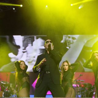 Vestido con un traje negro, gafas oscuras y acompañado de seis bellas bailarinas, el músico continuó el despliegue con notas de la banda Nirvana para continuar con "International love" cantando en inglés y creando una atmósfera festiva junto con sus músicos.