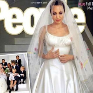 En la portada de su nuevo número, que sale a la venta el miércoles, puede verse a Angelina con su vestido de novia y también se aprecia una pequeña imagen de los actores junto a sus seis hijos.