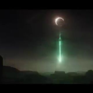 También se observa a la Estrella de la Muerte en eclipse lanzando su poderosa arma como un intenso rayo de luz y destruyendo todo a su paso.