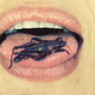 Las imágenes inician con el insecto en su lengua y después se abre la toma a su rostro completo, mientras Salma indica que se trata de un chapulín de Oaxaca, que después mastica.