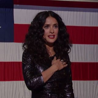 Entonces Letterman le preguntó qué tal era con el himno de Estados Unidos y le pidió que lo cantara, a lo que Salma accedió.