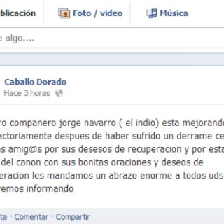"Nuestro compañero Jorge Navarro (El Indio) está mejorando satisfactoriamente después de haber sufrido un derrame cerebral gracias amig@s por sus deseos de recuperación.