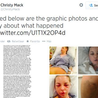 su cuenta de Twitter la golpiza que le propinó su ex novio, el luchador Jon Koppenhaver, mejor conocido como 'War Machine' el pasado viernes, luego de que éste la sorprendiera con un hombre en su departamento.