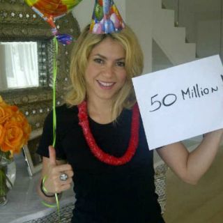 Para la celebración, Shakira aparece en la fotografía con un gorro y un globo de fiesta, y con un cartel que dice "50 millones".