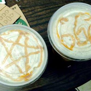 Facebook del gigante del café. En la foto uno de los cafés registra un dibujo similar a una estrella de cinco puntas. El número 666 fue rociado en caramelo en la parte superior de la otra bebida.