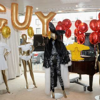 Los distintos modelos que la cantante usa en el video 'G.U.Y.' se exhiben en la recepción del edificio