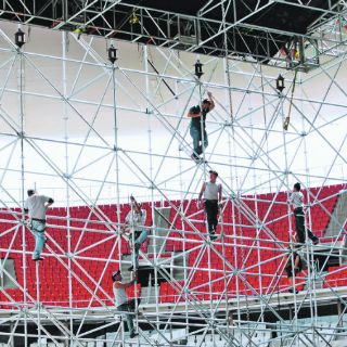 GUADALAJARA, JALISCO (23/FEB/2012).- A toda velocidad avanza el montaje del escenario que recibirá al británico Elton John mañana por la noche en el Estado Omnilife. El terreno se ha preparado para que sea un espectáculo colosal y lleno de efectos visuales, según informó personal a cargo de la producción del músico inglés en Guadalajara.