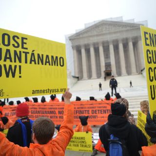 Ante el Tribunal Supremo, máxima instancia de la justicia estadounidense, el centenar de activistas -muchos de ellos ataviados con el característico uniforme naranja de los presos- repitió una y otra vez el grito "¡Cierren Guantánamo!" y unos quince manifestantes posaron de rodillas y con la cabeza cubierta por una bolsa negra.