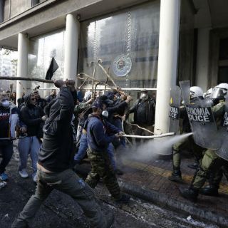 ATENAS, GRECIA (08/MAR/2017).- Centenares de agricultores griegos se enfrentaron hoy en Atenas con la policía antidisturbios ante el ministerio de Agricultura, en una protesta contra las subidas de impuestos y de sus cotizaciones de la seguridad social.