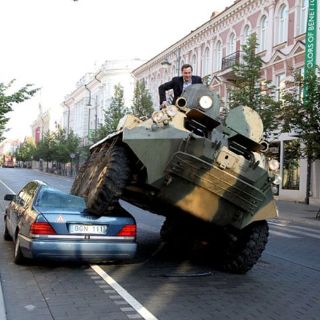 VILNIUS, LITUANIA (03/AGO/2011).- El alcalde de Vilnius, Arturas Zuokas, ha protagonizado una contundente campaña contra el estacionamiento ilegal en la ciudad lituana, atropellando con un tanque un Mercedes que estaba estacionado en un carril para bicicletas en el centro de la ciudad.