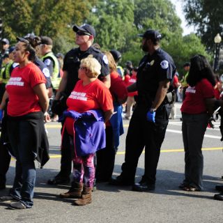 Sin resistirse al arresto, las mujeres fueron escoltadas a camiones de la policía, donde se les recogieron las pertenencias antes de ser transportadas a un centro de detención del Distrito de Columbia.