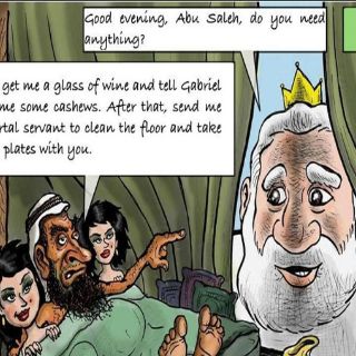 La caricatura en cuestión, publicada en el Facebook del escritor, representa a un musulmán en el paraíso, que pide a Alá que le sirva vino y que llame a la puerta antes de entrar a su habitación.