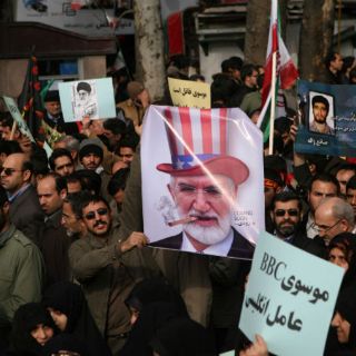La gente llevaba carteles del líder de la oposición reformista Mehdi Karroubi representado como el “Tío Sam” de Estados Unidos, durante el funeral (imagen).