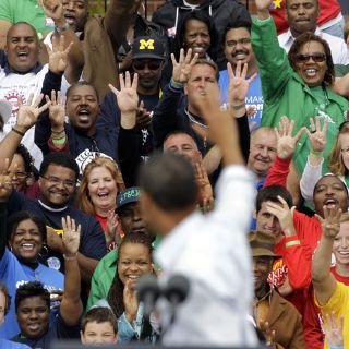 “Dada la urgencia de este momento, dadas las dificultades que mucha gente enfrenta, (los congresistas) tienen que ponerse de acuerdo”, dijo Obama a una muchedumbre que respondía diciendo “cuatro años más”.