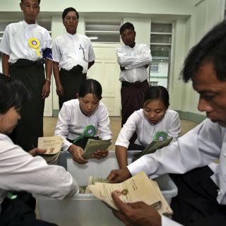 BIRMANIA (08/NOV/2010).- Varios responsables electorales cuentan los sufragios en un centro de votación en Naypyitaw.