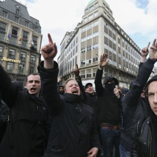 Unos 400 miembros de ultraderecha de Bélgica interrumpieron la concentración y se enfrentaron a los ciudadanos, destruyeron mobiliario urbano y tiraron bengalas a las fuerzas de seguridad cuando fueron dispersados con cañones de agua.