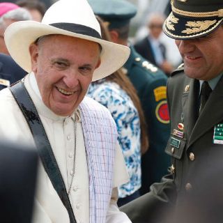Al bajar del avión, Francisco se veía alegre y sonriente, y al saludar al arzobispo de Cartagena, Jorge Enrique Jiménez Carvajal, no le dio el apretón de manos sino un afectuoso abrazo.