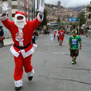Los participantes, niños, niñas, hombres y mujeres disfrazados de Papás Noel, duendes ayudantes y renos, entre otros personajes, corrieron desde el barrio de Achumani hasta Obrajes, ambos en el sur de La Paz, en la 'Primera Carrera Navideña - Circuito 5k'.