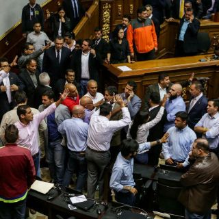Dentro los diputados debatían una respuesta a una decisión del Consejo Nacional Electoral (CNE) de suspender un referéndum contra Maduro, luego que varios tribunales penales admitieron denuncias del oficialismo sobre un presunto fraude con firmas reunidas en abril pasado para pedir la consulta.