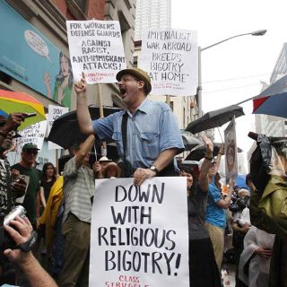 Mientras sonaba la canción de Bruce Springsteen “Born in the USA” (nacido en Estados Unidos), los opositores al proyecto gritaban “Ninguna mezquita de ninguna manera” y portaban pancartas en las que se podía leer, entre otras frases, “Sharia” (Ley Islámica), escrita con pintura roja que imitaba sangre.