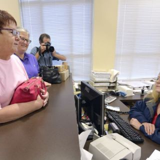 Un asistente le dijo a April Miller y Karen Roberts, quienes entraron en la oficina seguidas por decenas de cámaras de televisión, que no se entregarían licencias y se negó a darles acceso a Davis.