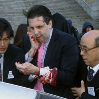 El agresor, Kim, que fue arrestado en el momento, es el jefe de una organización liberal que protesta contra las reclamaciones territoriales japonesas sobre los islotes surcoreanos de Dokdo.