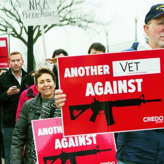 En Washington, veteranos de guerra y residentes se agruparon frente a las instalaciones de la Asociación Nacional del Rifle, para manifestarse por el control de armas.