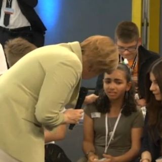 Después de escuchar su historia Merkel intentaba explicar diplomáticamente sobre el asilo político, le responde que entiende su situación, pero que "a veces la política es dura". De pronto detiene su discurso y se da cuenta que la pequeña estaba llorando; de inmediato se acerca e intenta consolarla...