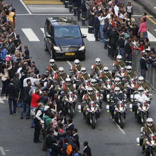 El cortejo fúnebre está formado por una furgoneta negra que transporta el ataúd cubierto con una bandera sudafricana y está precedido por unos veinte agentes de policía motorizados.