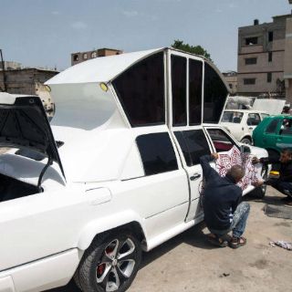 Un organizador de matrimonios palestino improvisa su propio vehículo con piezas de otros carros ya que no puedo importar una