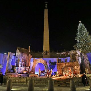 A unos pocos metros ya se puede admirar un pesebre monumental compuesto por 24 figuras de tamaño natural en madera esculpida y pintada, regalo de la provincia italiana de Trento.