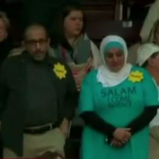 Imágenes de televisión muestran un acto en Carolina del Sur en el que una mujer, llamada Rose Hamid, azafata de 56 años, lleva un pañuelo en la cabeza y una camiseta verde holgada en la que se puede leer: "Salam. Vengo en paz".