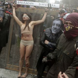 Mientras cerca de mil personas participaban del polémico acto en el Teatro Caupolicán, decenas de manifestantes se enfrentaron a efectivos de la militarizada policía de Carabineros en las afueras del recinto, ubicado en pleno centro de Santiago.