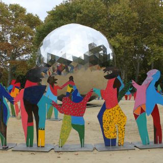 A su alrededor hay setenta figuras de distintas formas y colores, una por cada año de la ONU, enlazadas de la mano para dar un sentimiento de hermandad.