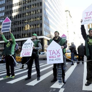 NUEVA YORK, ESTADOS UNIDOS (01/DIC/2011).- Miembros del movimiento de "indignados" Ocupa Wall Street marcharon hoy junto a decenas de enfermos de sida para pedir a las autoridades de Nueva York que impongan una mayor fiscalidad a quienes tienen rentas más altas y así costear tratamientos y otros servicios en favor de quienes padecen la enfermedad.